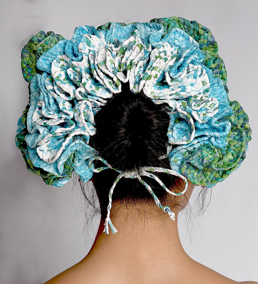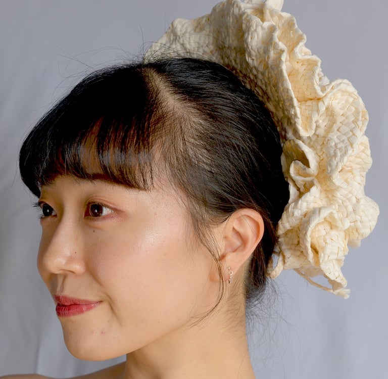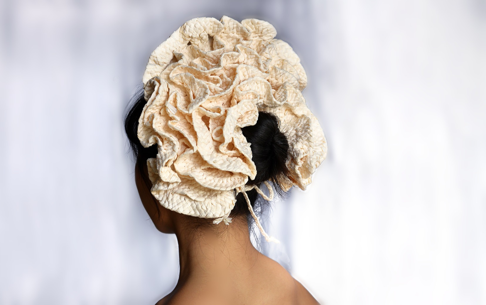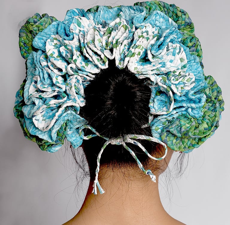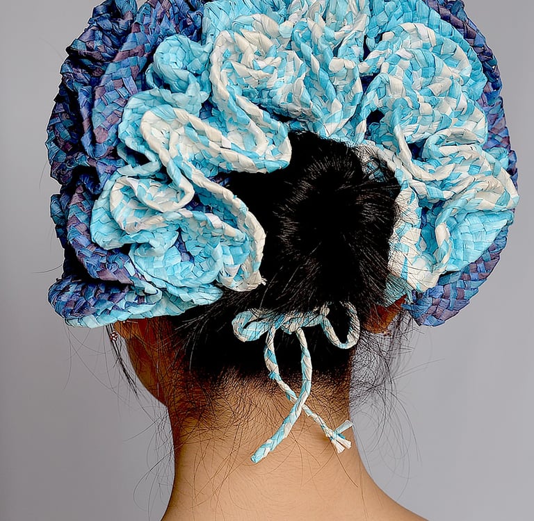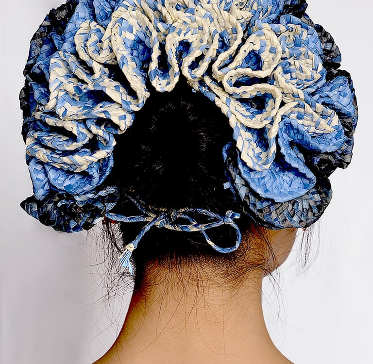 It is handwoven from sustainable paper raffia and crafted in Barcelona, inspired by the rich mushroom landscapes of Catalonia and by my hometown, Guizhou, China. Born from the weaving traditions of the Mediterranean and Iberian Peninsulas, it blends structure and softness the way mushrooms mix magic and mystery. It is soft, flexible, and almost weightless. You might forget you are wearing it until someone asks where you found it.