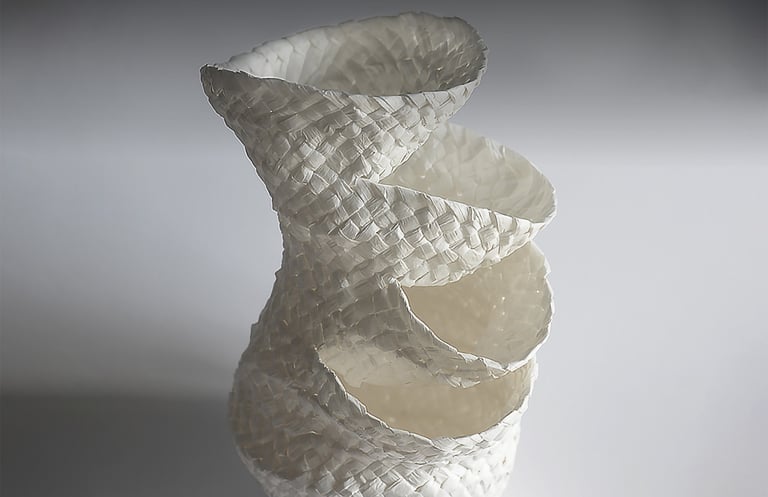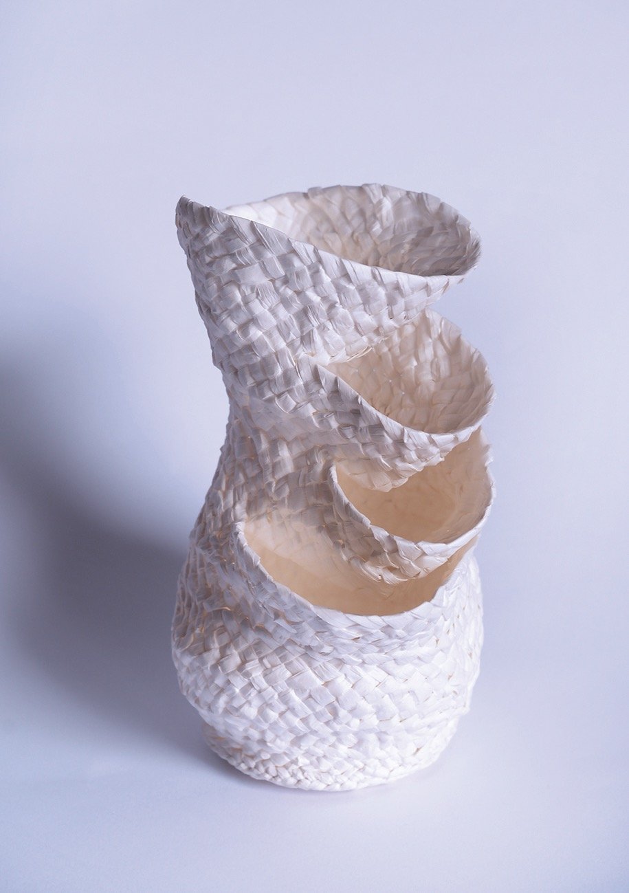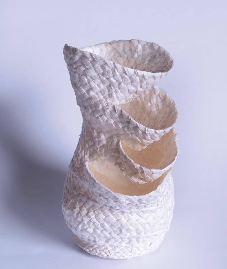 This series of Vase "China" is a mixture of Mediterranean and Chinese cultures. To form the Mediterranean side, it is made using traditional Spanish weaving techniques. Historically, this technique has appeared in numerous regions at the same time, such as Saudi Arabia and Yemen. The unique texture is the entrance to the identity of this area. The shape of the white vase resembles the way fishmongers stack fish together in circles to form towers in Spanish fish markets. It is such a unique representation of fish that does not exist in Asia. That is why there are rotating openings from the body of the vase.