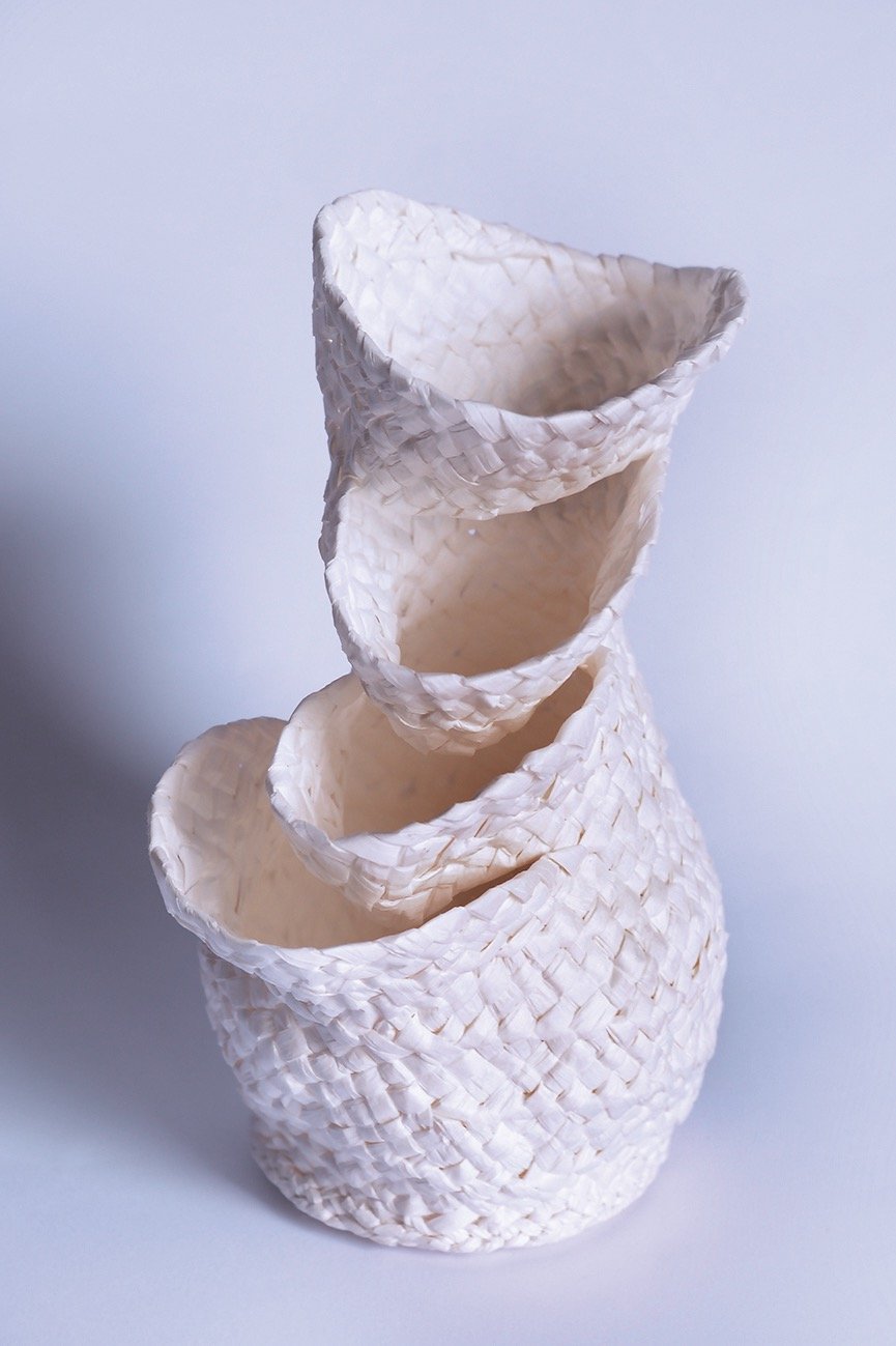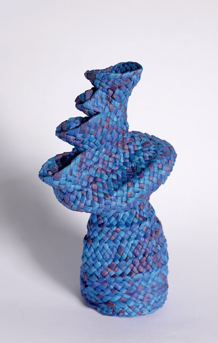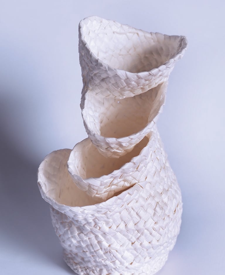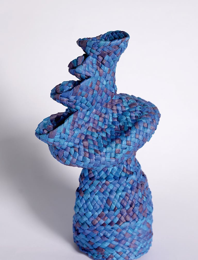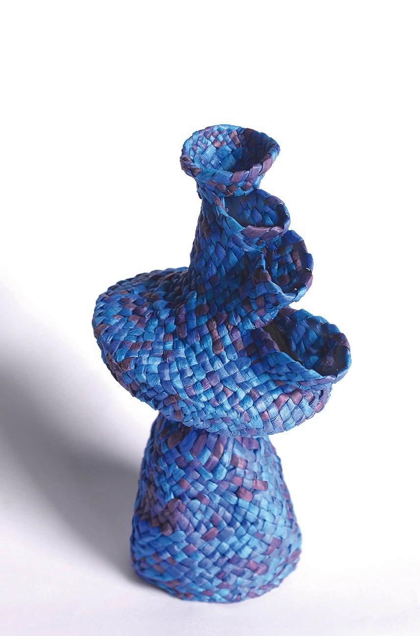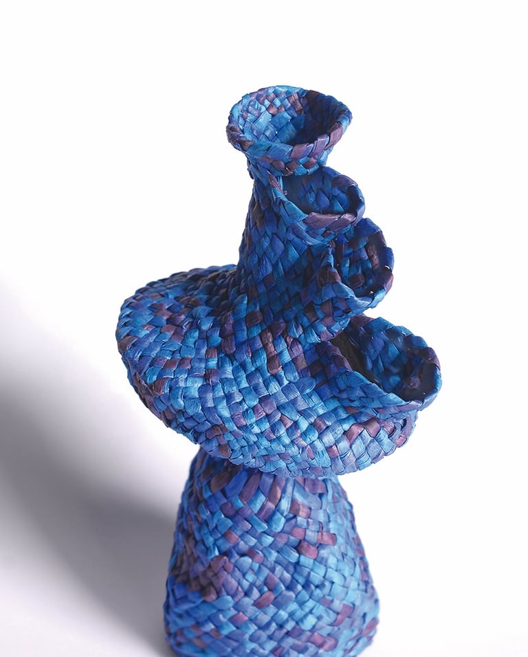 From a material perspective, paper raffia gives the vases a soft texture, delicate appearance, and the lack of functionality in terms of water containment. Along with the flexibility of the Palmeteo as the weaving technique, the vases are shaped like the braids rise, fireworks setting off, and like climbers trying to reach the most brilliant peak; and hence the vases are intertwined with a poetic essence.